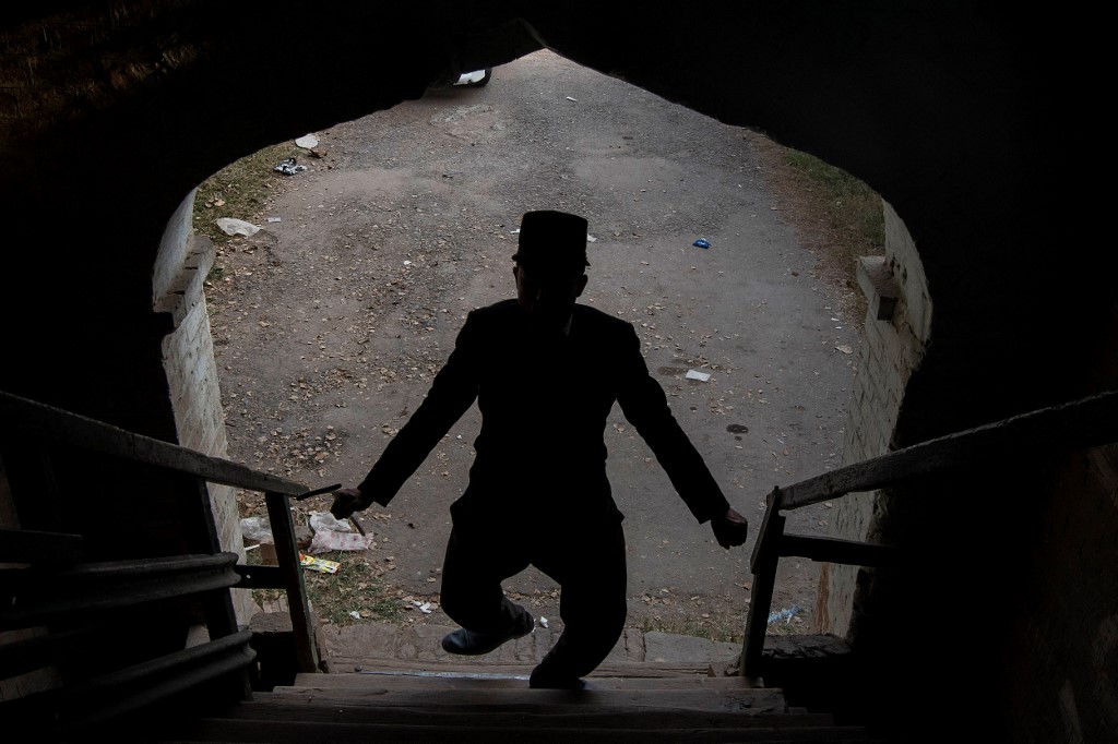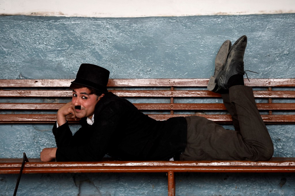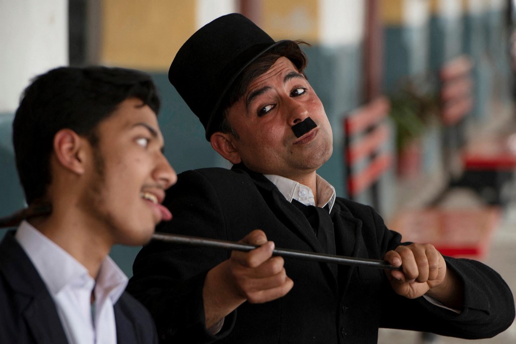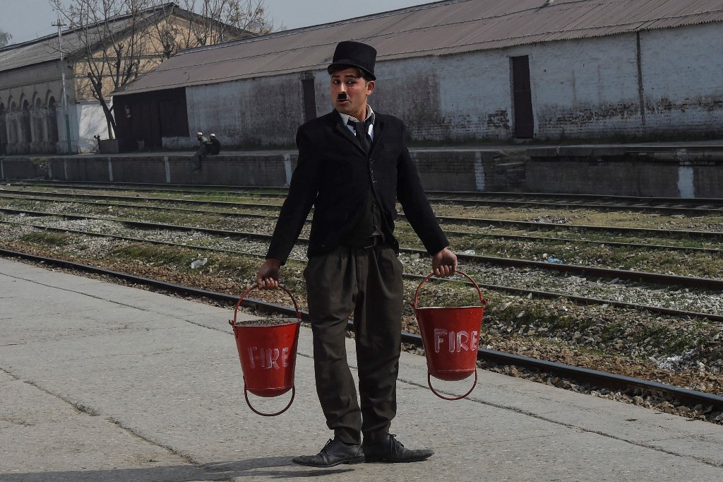 Dressed as Chaplin, Khan leaps into passing rickshaws, annoys local shopkeepers, and occasionally swats onlookers with his cane as he shuffles bow-legged across the city, where he is frequently mobbed by fans asking for selfies. The act has proven to be a hit.