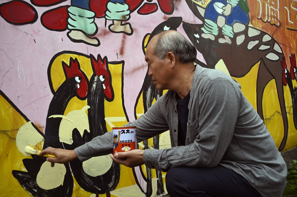 This picture taken on May 21, 2019 shows Hakka graffiti artist Wu Tsun-hsien painting a wall in the Taiwanese village of Ruan Chiao. Nestled in the mist-covered foothills of Taiwan's central mountain range, Ruan Chiao village is virtually devoid of young people, but artist Wu Tsun-hsien is coaxing the Instagram generation back by transforming local homes into a canvas of colour. Sam YEH / AFP