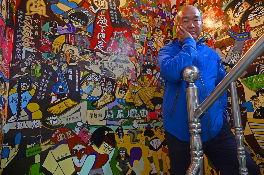 This picture taken on March 30, 2019 shows Hakka graffiti artist Wu Tsun-hsien posing for photos at his home in the Taiwanese village of Ruan Chiao. Nestled in the mist-covered foothills of Taiwan's central mountain range, Ruan Chiao village is virtually devoid of young people, but artist Wu Tsun-hsien is coaxing the Instagram generation back by transforming local homes into a canvas of colour. Sam YEH / AFP