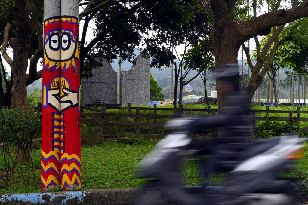 This picture taken on March 30, 2019 shows an motorcyclist riding past a utility pole painted by Hakka graffiti artist Wu Tsun-hsien in the Taiwanese village of Ruan Chiao. Nestled in the mist-covered foothills of Taiwan's central mountain range, Ruan Chiao village is virtually devoid of young people, but artist Wu Tsun-hsien is coaxing the Instagram generation back by transforming local homes into a canvas of colour. Sam YEH / AFP
