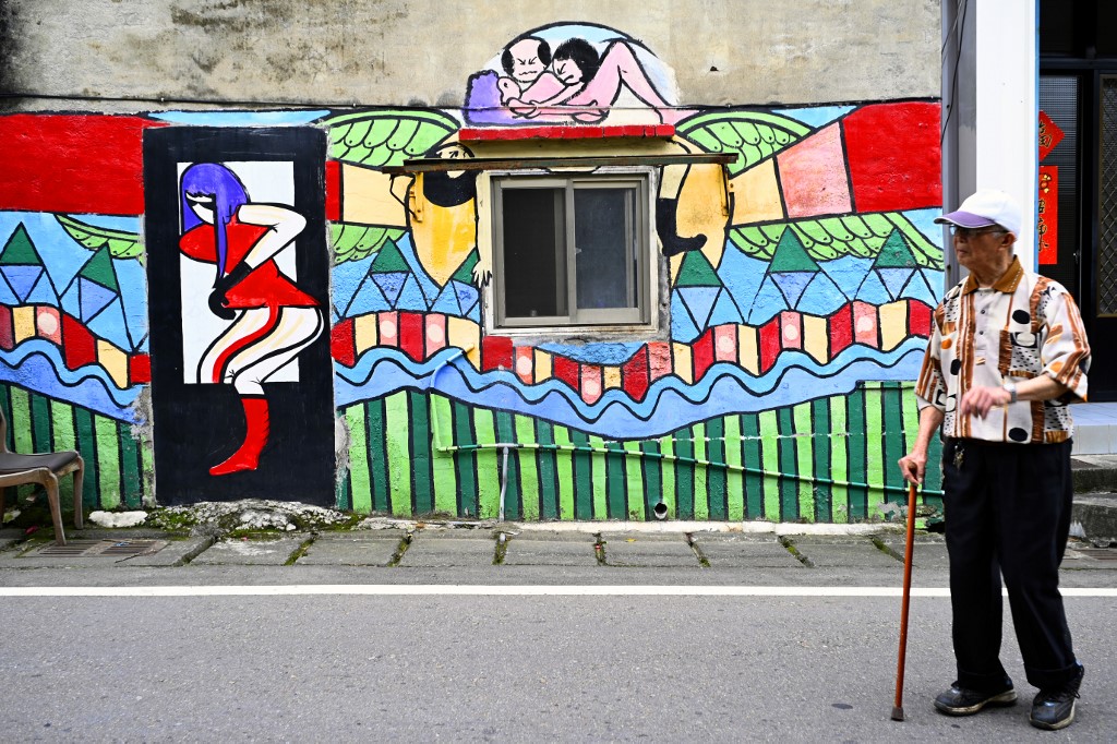 This picture taken on March 30, 2019 shows a local resident walking past a wall painted by Hakka graffiti artist Wu Tsun-hsien in the Taiwanese village of Ruan Chiao. Nestled in the mist-covered foothills of Taiwan's central mountain range, Ruan Chiao village is virtually devoid of young people, but artist Wu Tsun-hsien is coaxing the Instagram generation back by transforming local homes into a canvas of colour. Sam YEH / AFP