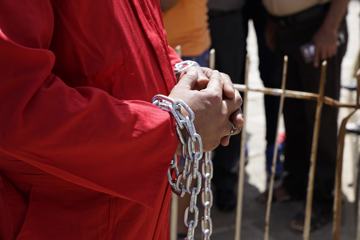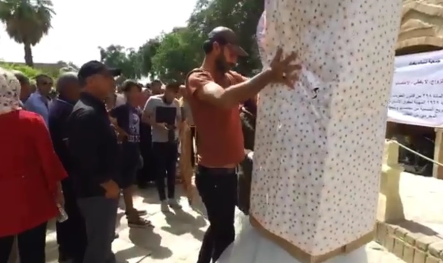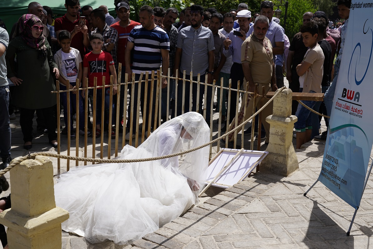 Last week, a number of Baghdad residents found themselves witness to an extraordinary scene. Passers-by on Al-Muntanabbi Street, a place known for attracting artists and intellectuals, saw a man in an orange prison jumpsuit in chains. Standing next to him, inside a huge gift-wrapped box, was a woman in a wedding dress. The box read “Gift of the Rapist”.