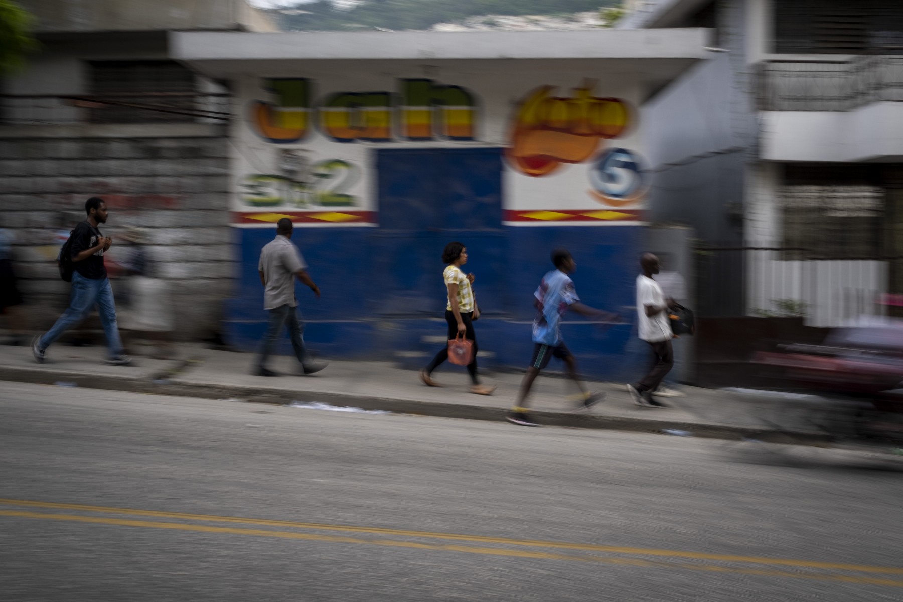 People walk on the sidewalk of an empty but otherwise busy street in Port-au-Prince on October 21, 2021. On Thursday, near one barricade of flaming tires, protestors accused authorities of favoring fuel importers to the detriment of renewable energy development. (Photo by Ricardo ARDUENGO / AFP)
