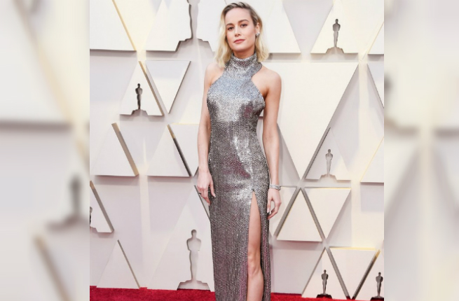“Captain Marvel” star Brie Larson showed off a silver high-neck dress by Celine, designed by creative head Hedi Slimane, who is of Tunisian descent.