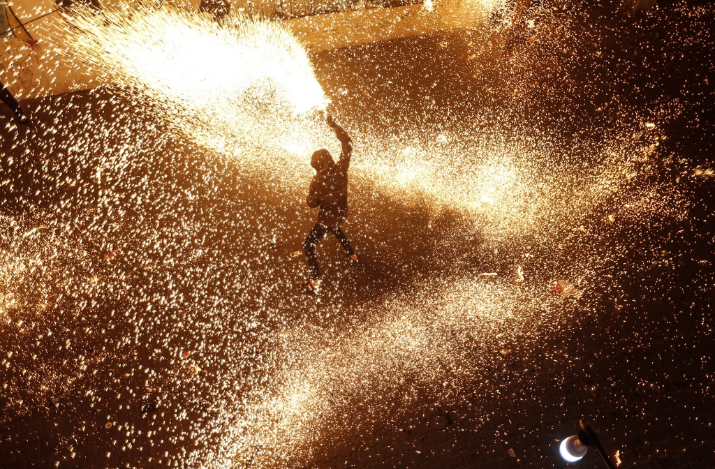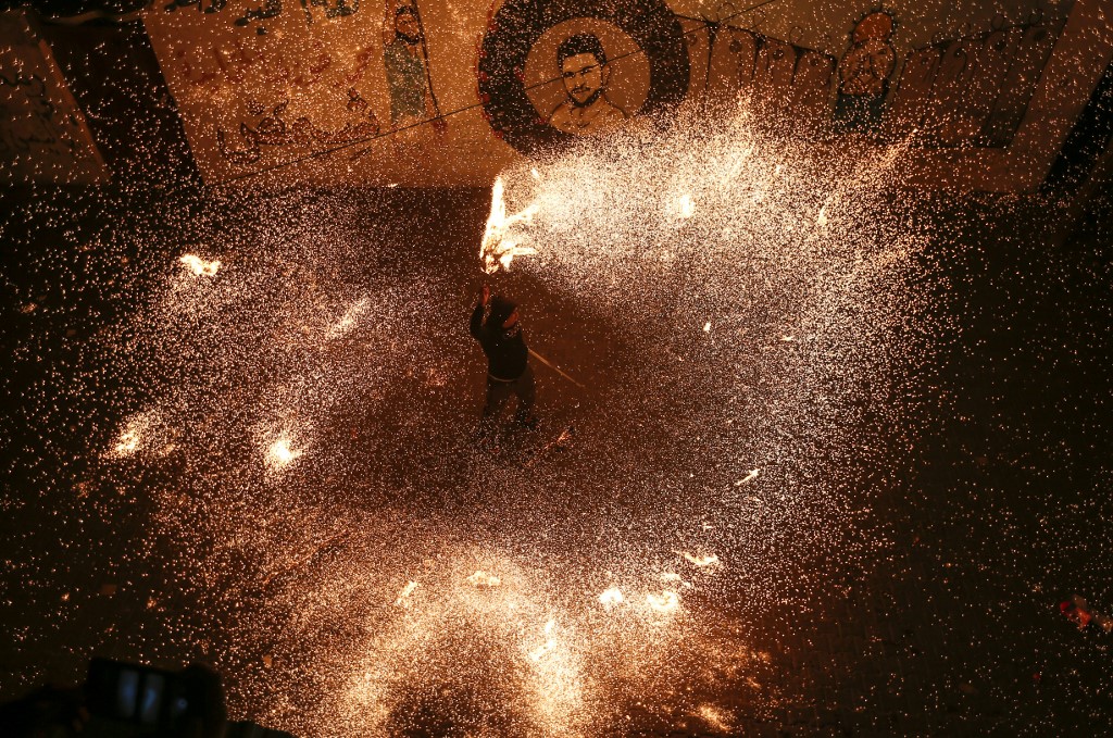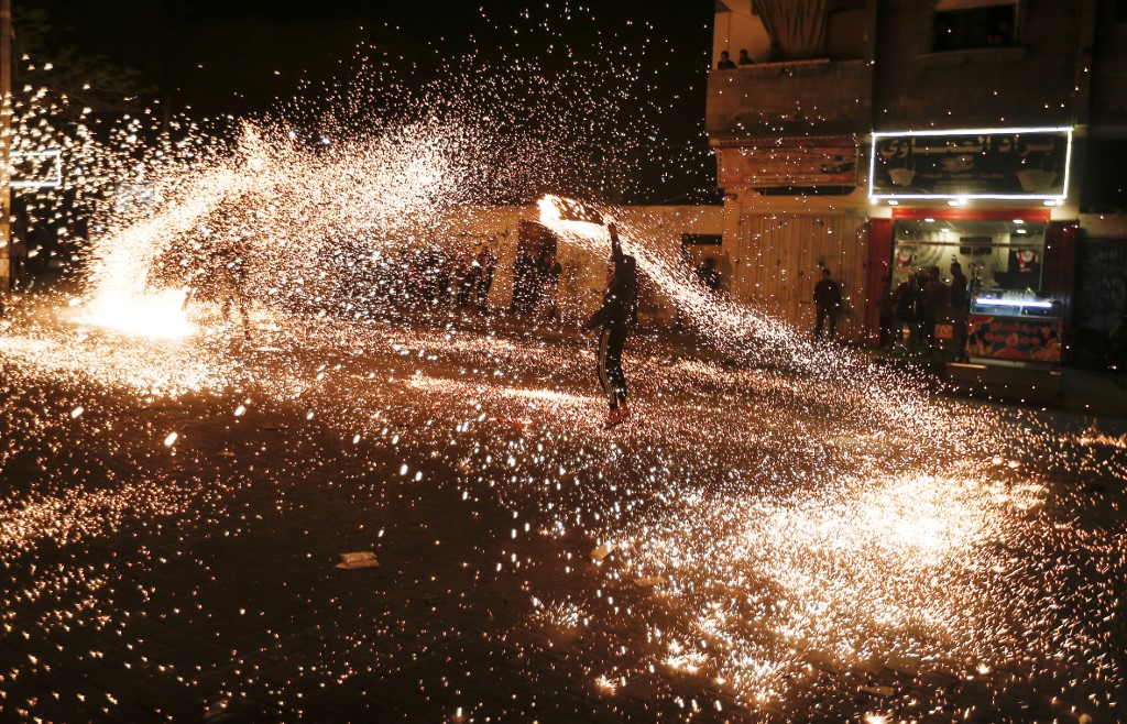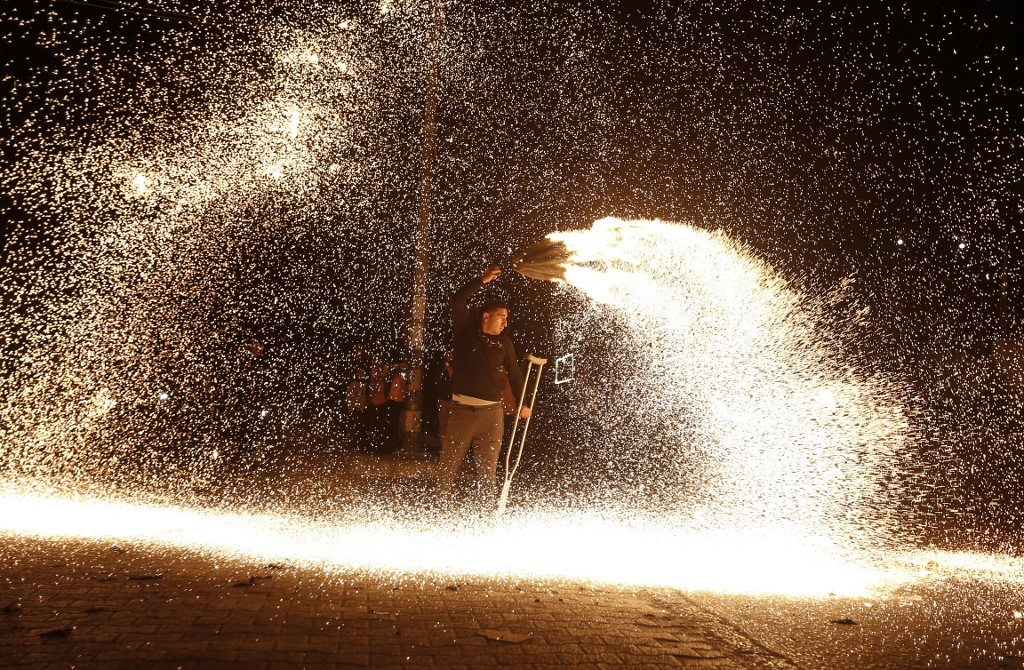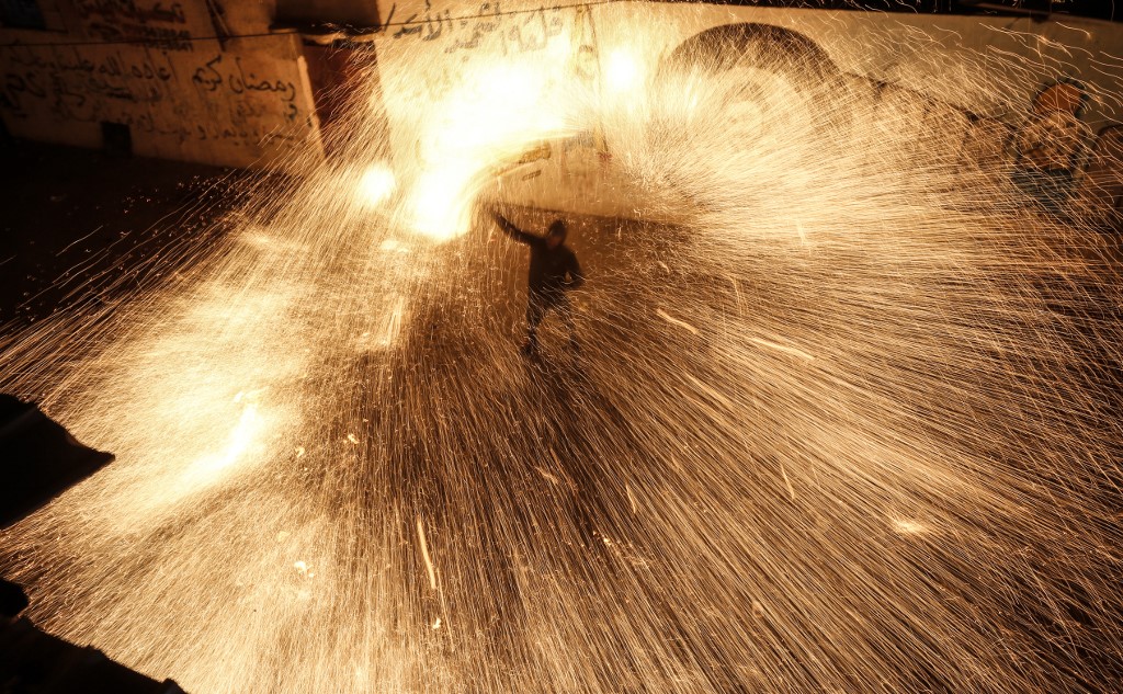 A Palestinian youth swings a homemade sparkler firework as people celebrate on a night of the Muslim holy month of Ramadan in Rafah refugee camp, in the southern Gaza Strip.