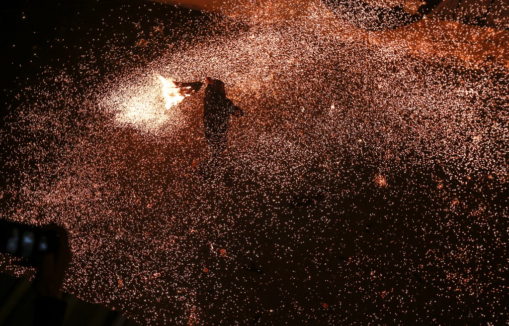 A Palestinian youth swings a homemade sparkler firework as people celebrate on a night of the Muslim holy month of Ramadan in Rafah refugee camp, in the southern Gaza Strip, on May 4, 2020. MAHMUD HAMS / AFP