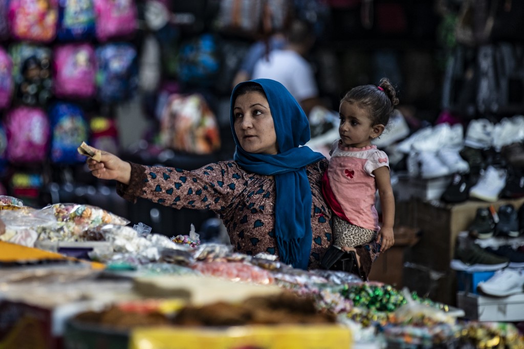 A woman pays a merchant at a market in the Kurdish-majority city of Qamishli in northeast Syria. Delil SOULEIMAN / AFP