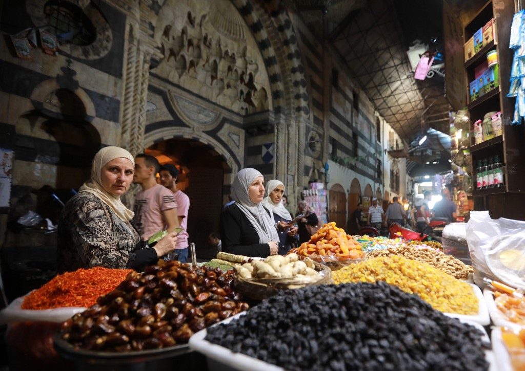 Women run errands at the Bzourieh market in the center of Damascus. LOUAI BESHARA / AFP