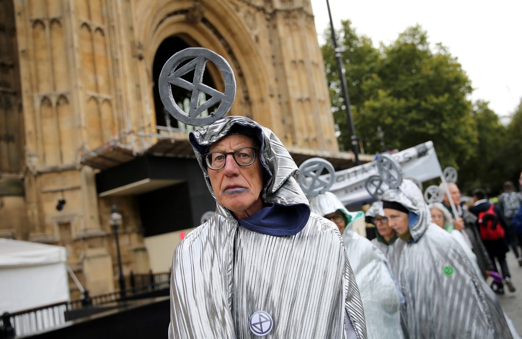 Demonstrators calling themselved 'Aged Agitators' wear the climate change activist group Extinction Rebellion's logo on their heads as they demonstrate outside the Houses of Parliament in central London, on October 7, 2019. Extinction Rebellion has scheduled non-violent protests chiefly in Europe, North America and Australia over the next fortnight. ISABEL INFANTES / AFP