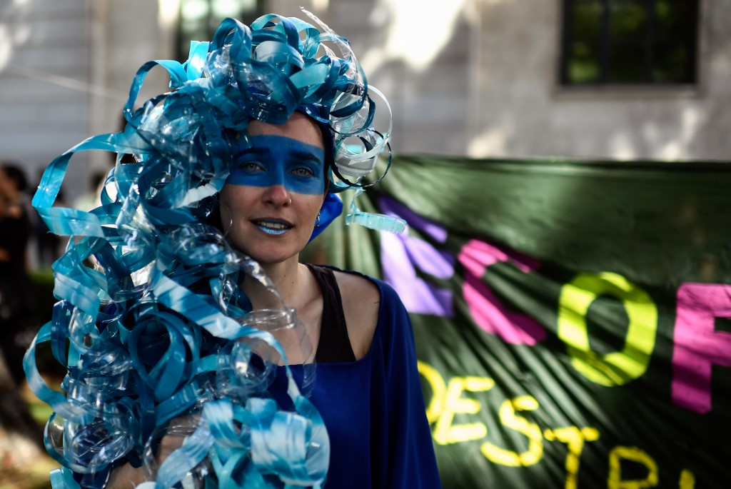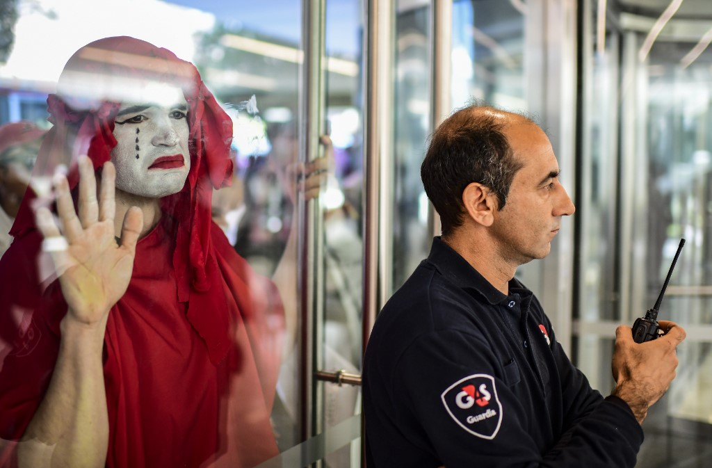 A protestor (L) takes part in a demonstration called by climate change activist group Extinction Rebellion, in front of the lobby of the building where the Bayer-Monsanto office is located in Buenos Aires on October 7, 2019. The year-old group Extinction Rebellion has energised a global movement demanding governments drastically cut the carbon emissions that scientists have shown to cause devastating climate change. RONALDO SCHEMIDT / AFP