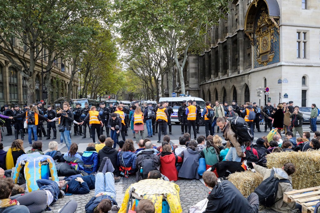 French Gendarmes stand ready as protesters sit on the ground to block the Pont au Change bridge during a demonstration called by climate change activist group Extinction Rebellion, on October 7, 2019 in front of the Conciergerie in Paris. AFP