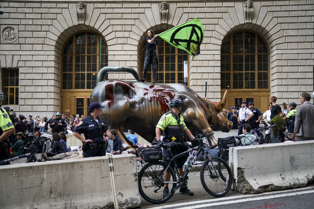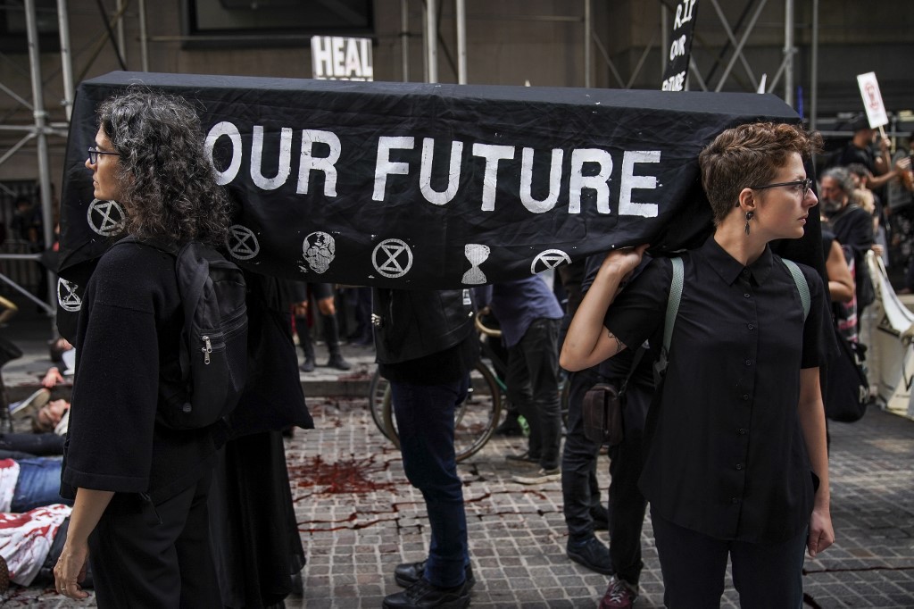 Environmental activists participate in a die-in during a rally for action against climate change in the Financial District October 7, 2019 in New York City. The group 'Extinction Rebellion' has organized protests and sit-ins around the globe today to push for action against climate change. Drew Angerer/Getty Images/AFP D