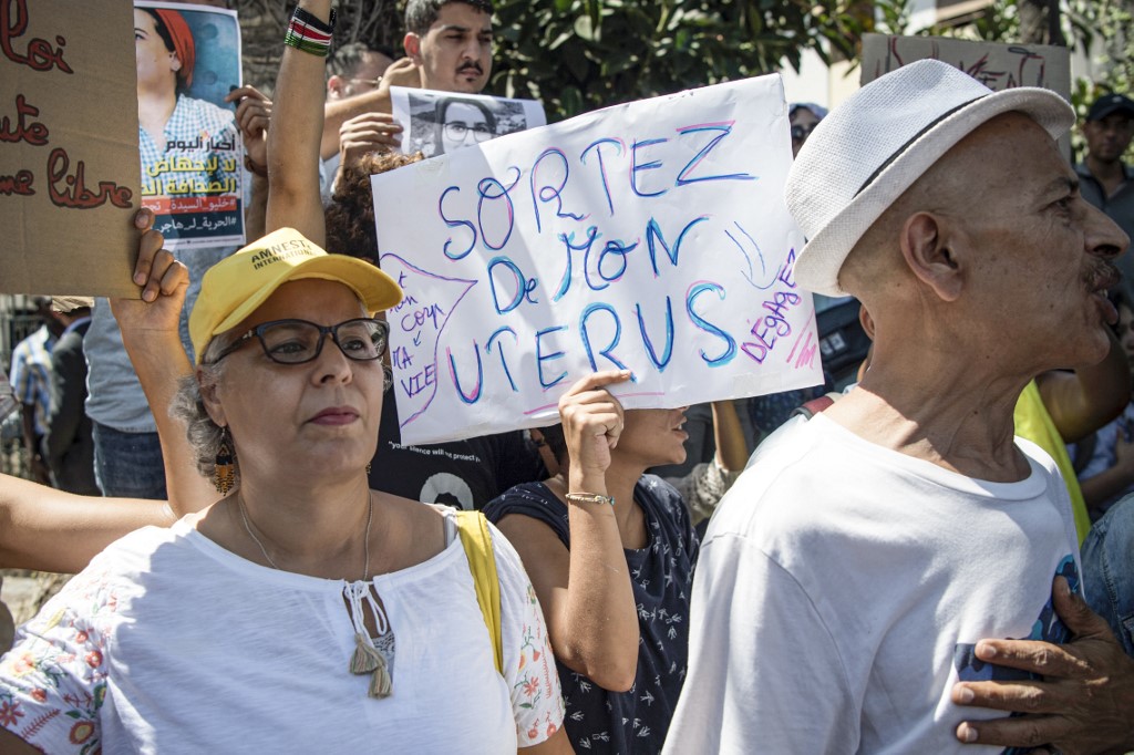 A demonstrator holds up a sign reading in French "get out of my uterus", during a protest outside a courthouse holding the trial of Hajar Raissouni, a Moroccan journalist of the daily newspaper Akhbar El-Youm, on charges of abortion, in the capital Rabat on September 9, 2019. FADEL SENNA / AFP