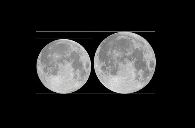 Fourteen percent bigger looks like this. In this illustration, the Galileo spacecraft shows the approximate difference in apparent size between a full moon at perigee.