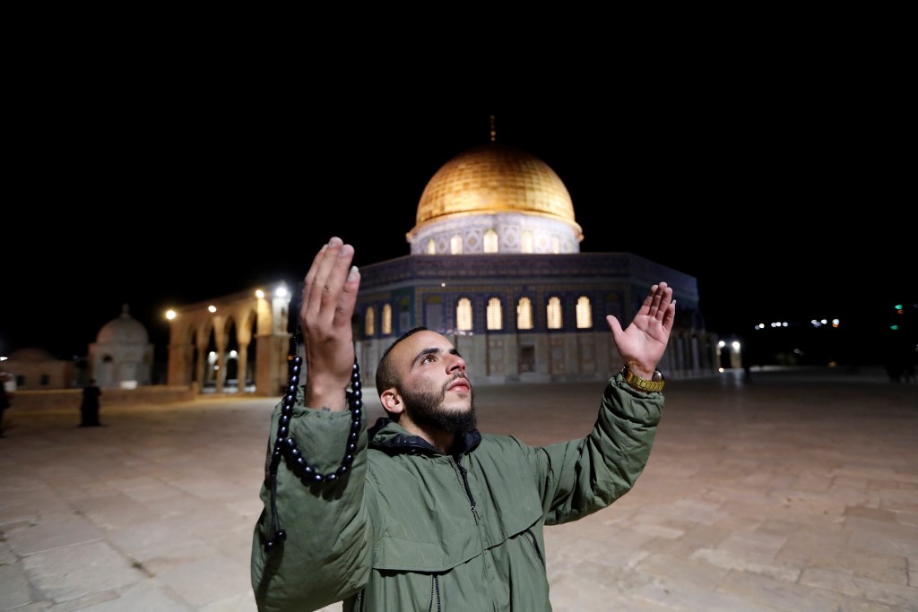 Palestinian men react as they walk in front of the Dome of Rock at the Al-Aqsa Mosque compound, before the start of the dawn prayer (salat al-fajr) inside the compound in Jerusalem's Old City, on May 31, 2020, after a two-month closure due to the COVID-19 pandemic. AHMAD GHARABLI / AFP