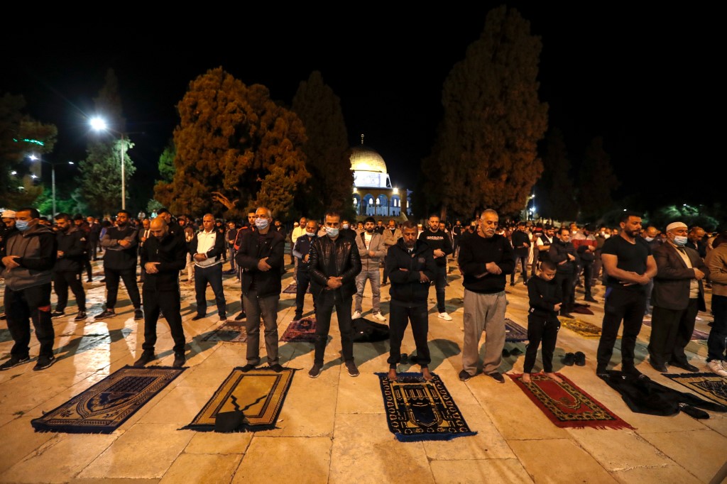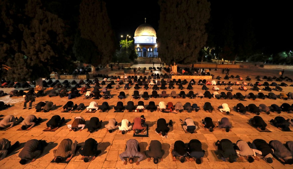 Palestinians perform the dawn prayer (salat al-fajr) inside the al-Aqsa mosque compound, in Jerusalem's Old City on May 31, 2020, after a two-month closure due to the COVID-19 pandemic. AHMAD GHARABLI / AFP