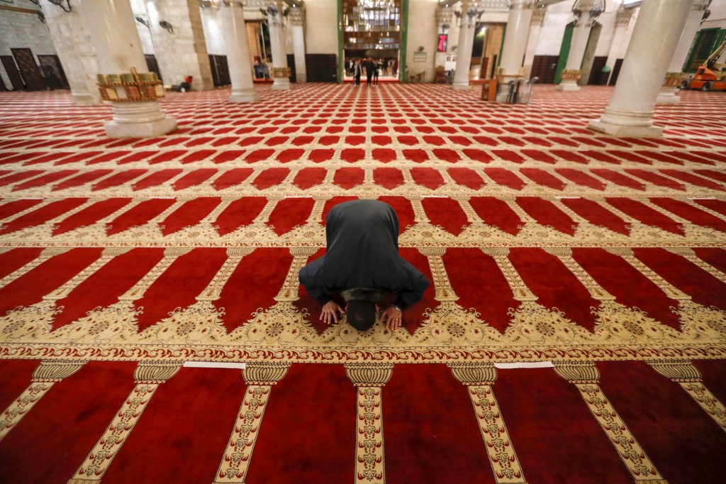 A Palestinian man performs the morning prayer inside Al-Aqsa mosque, before the start of the dawn prayer (salat al-fajr) in Jerusalem's Old City, on May 31, 2020, after a two-month closure due to the COVID-19 pandemic. AHMAD GHARABLI / AFP