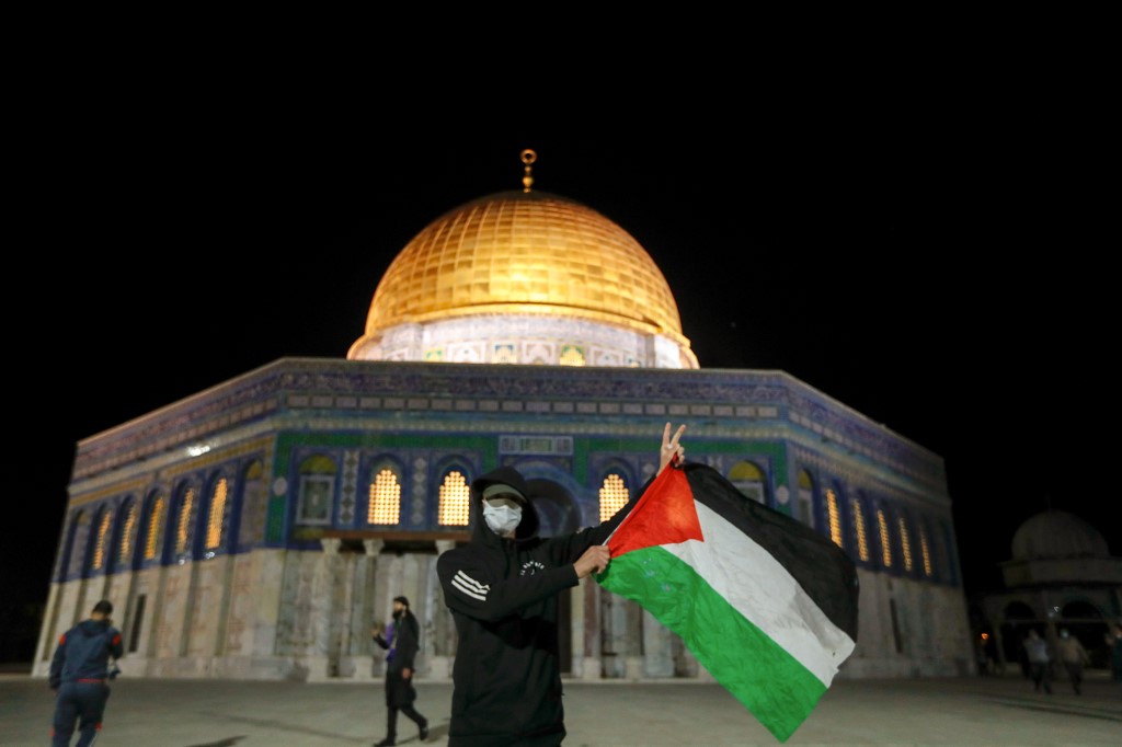 A Palestinian youth waves a national flag in front of the Dome of Rock at the Al-Aqsa Mosque compound, before the start of the dawn prayer (salat al-fajr) inside the compound in Jerusalem's Old City, on May 31, 2020, after a two-month closure due to the COVID-19 pandemic. AHMAD GHARABLI / AFP