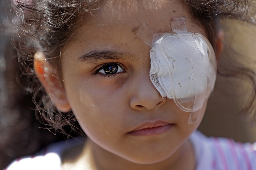 Sama al-Hamad, 6-year-old Syrian girl who lost her left eye in the August 4 cataclysmic explosion, poses for a picture on the roof of her damaged house in Beirut's Mar Mikhael district overlooking the blast site on August 16, 2020. AFP/File
