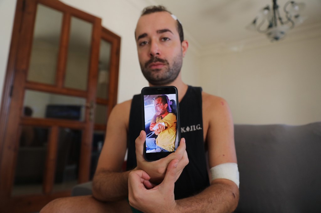 Lebanese makeup artist Sharbel Hasbany, 29, who was injured in the massive Beirut port explosion, displays an image on his phone of himself after the blast, during an interview at home in the Sin el-Fil neighbourhood of the Lebanese capital, on August 16, 2020. ANWAR AMRO / AFP