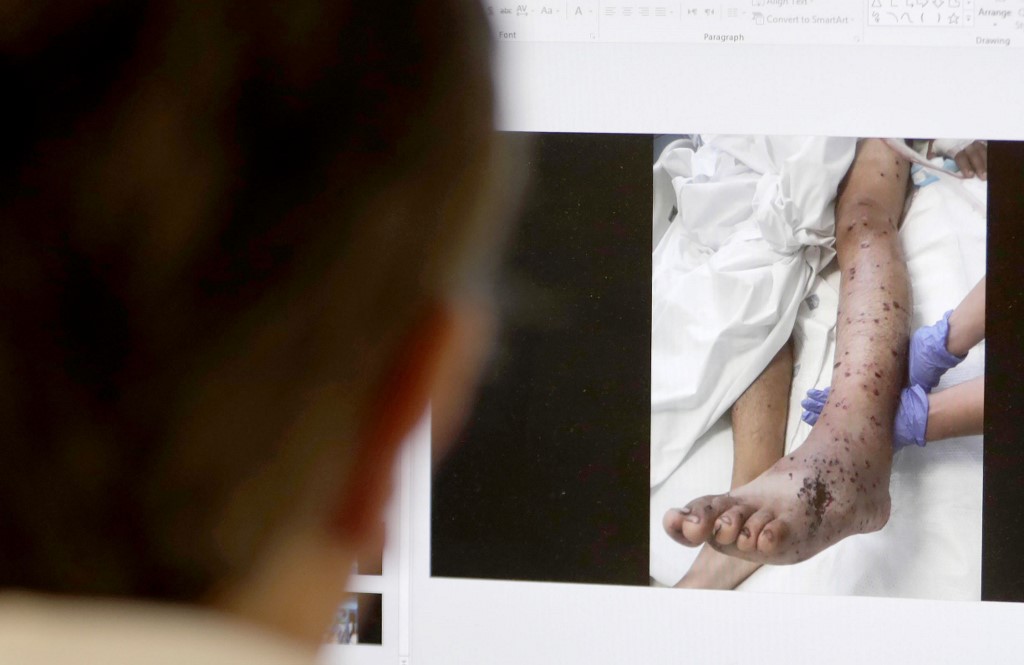Lebanese doctor Selim Nasser displays the image of a patient's body who was hit by small lead pellets. ANWAR AMRO / AFP