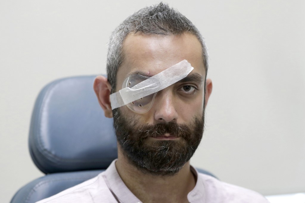 Maroun Dagher, 34-year-old web developer who lost sight in one eye due to the August 4 cataclysmic explosion, poses for a picture during his third checkup at the Eye and Ear hospital, north of the Lebanese capital Beirut, on August 17, 2020. ANWAR AMRO / AFP
