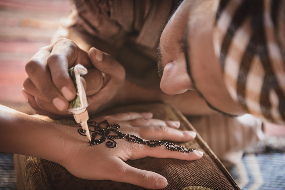 Bedouin making henna on a woman's hand. Hand decorations are usually done by a relative of the bride in her home (Shutterstock/File Photo)