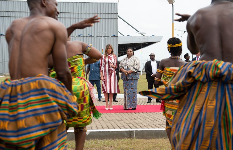 US First Lady Melania Trump (C-L) and Rebecca Akufo-Addo, the First Lady of Ghana, watch traditional dancers during an arrival ceremony after landing at Kotoka International Airport in Accra October 2, 2018. (SAUL LOEB / AFP)