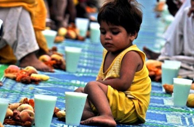 Pakistan's Karachi: Children congregate in a public tent setting to mark the break of fast food stuff, prepared for Iftar for fellow Pakistani Muslims.