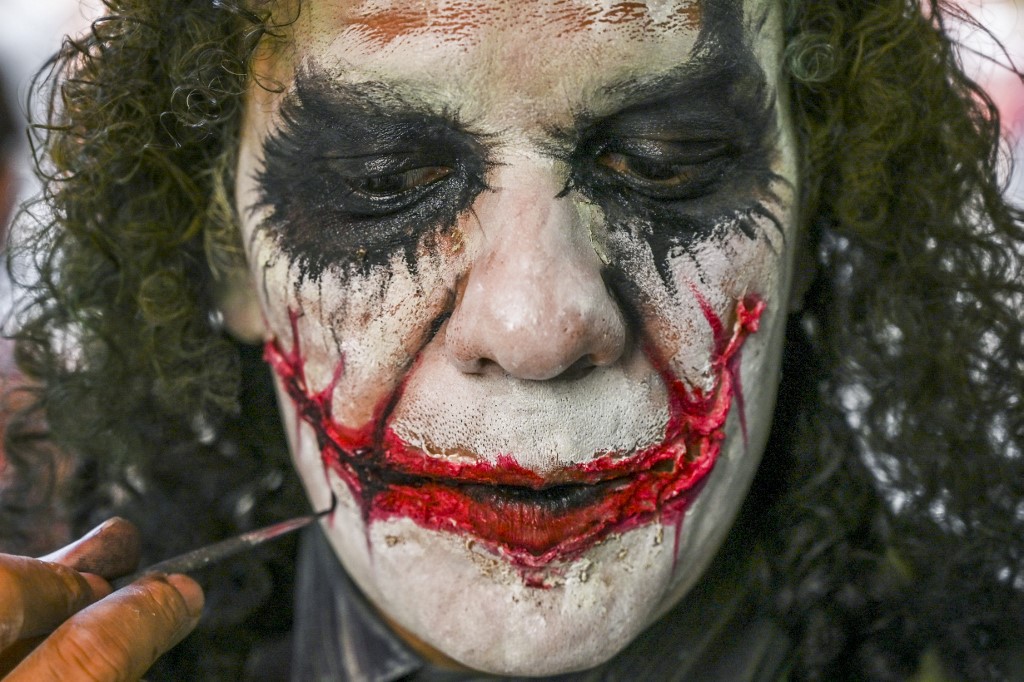 The transformation begins in front of the mirror. Using a brush, he removes the corners of his lips, colors them in red, testifies to his face.