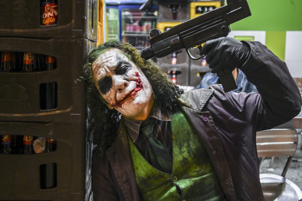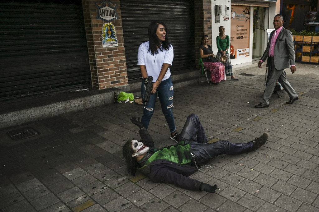 Joker who roams the streets and scares passersby it's Johnny Tales, a comedian who migrated from Venezuela after being attacked by real criminals.