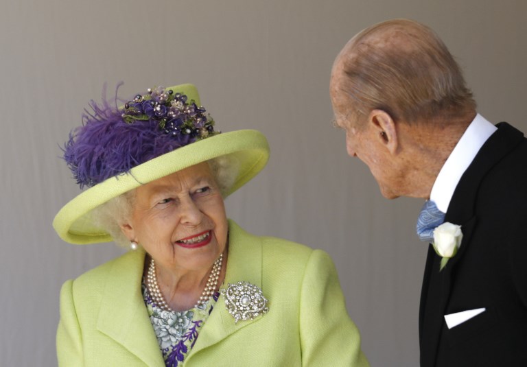 Britain's Queen Elizabeth II (L) talks with Britain's Prince Philip, Duke of Edinburgh (R) as they leave after attending the wedding ceremony of Britain's Prince Harry, Duke of Sussex and US actress Meghan Markle at St George's Chapel, Windsor Castle, in Windsor, on May 19, 2018. Alastair Grant / AFP