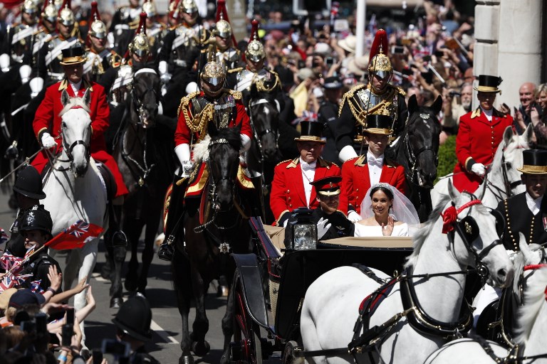 Britain's Prince Harry, Duke of Sussex and his wife Meghan, Duchess of Sussex travel in the Ascot Landau Carriage during their carriage procession on the High Street in Windsor, on May 19, 2018 after their wedding ceremony. Adrian DENNIS/ AFP
