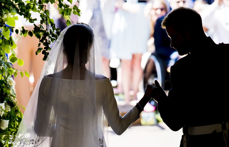 Britain's Prince Harry, Duke of Sussex (R) removes the veil of US actress Meghan Markle (L) as they stand at the altar together before Archbishop of Canterbury Justin Welby in St George's Chapel, Windsor Castle, in Windsor, on May 19, 2018 during their wedding ceremony. Owen Humphreys/ AFP
