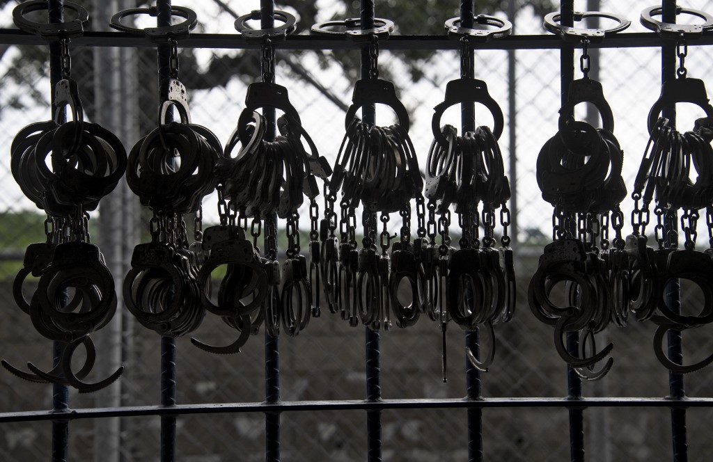 Handcuffs hang from a railing during a search operation at the maximum security prison in Izalco, Sonsonate, El Salvador, on September 4, 2020. Authorities from the General Directorate of Penal Centres (DGCP) visited three Salvadorean prisons, some of maximum security, to check the situation of inmates and carry out searches amid the COVID-19 novel coronavirus pandemic. Yuri CORTEZ / AFP