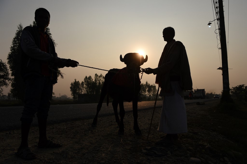 Hindu devotees lead a buffalo along a road towards Gadhimai Festival near Bariyarpur on December 1, 2019. PRAKASH MATHEMA / AFP