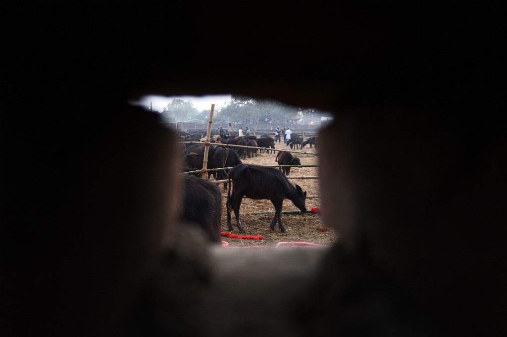 Buffaloes are seen through a hole as they stand in the sacrifice enclosure ahead of Gadhimai Festival in Bariyarpur, 160 km south of the capital Kathmandu, on December 1, 2019. PRAKASH MATHEMA / AFP