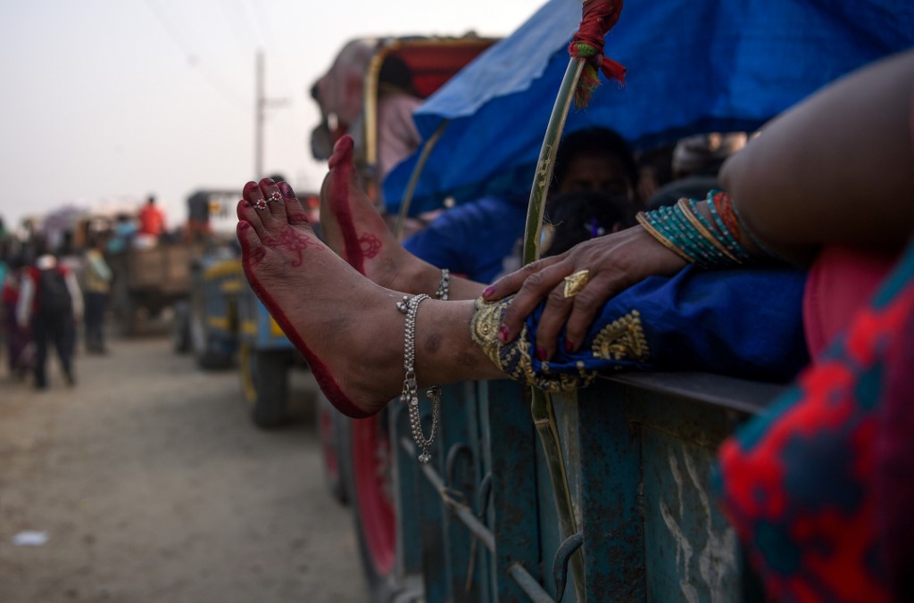 A devotee stretches her legs as she travels in a vehicle ahead of Gadhimai Festival in Baryarpur, 160 kms south of the Kathmandu, on December 2, 2019. Thousands of Hindu worshippers are flocking to a village in southern Nepal on December 2, defying court orders and calls by animal activists, in preparation for the world's biggest animal sacrifice. PRAKASH MATHEMA / AFP