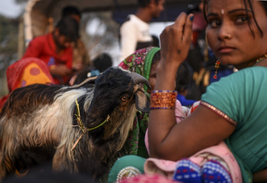 Hindu devotees travel with a goat in a vehicle ahead of Gadhimai Festival in Baryarpur, 160 kms south of the Kathmandu, on December 2, 2019. Thousands of Hindu worshippers are flocking to a village in southern Nepal on December 2, defying court orders and calls by animal activists, in preparation for the world's biggest animal sacrifice. PRAKASH MATHEMA / AFP