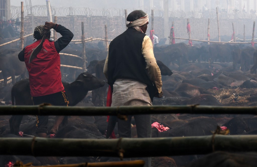 People watch Hindu devotee slaughter buffalos as offering during the Gadhimai Festival in Bariyarpur on December 3, 2019. Thousands of Hindu devotees gathered in southern Nepal for a festival believed to be the world's biggest ritual animal slaughter, despite court orders and calls by animal activists to end the event. The sacrifices take place every five years in Bariyarpur village close to the Indian border, in honour of the Hindu goddess of power. Prakash MATHEMA / AFP