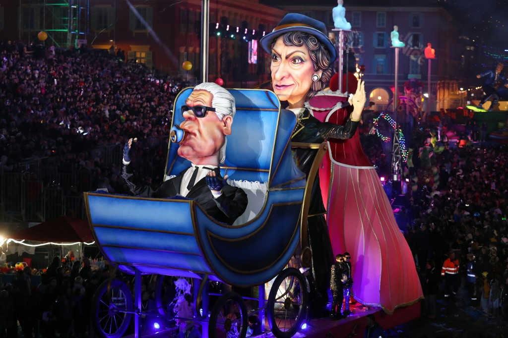Giant figures depicting German fashion designer Karl Lagerfeld and French fashion designer Coco Chanel are seen during the 136th Nice Carnival parade in Nice, southeastern France, on February 15, 2020. The Carnival takes place until February 29, 2020 on the theme 'King of Fashion'. VALERY HACHE / AFP