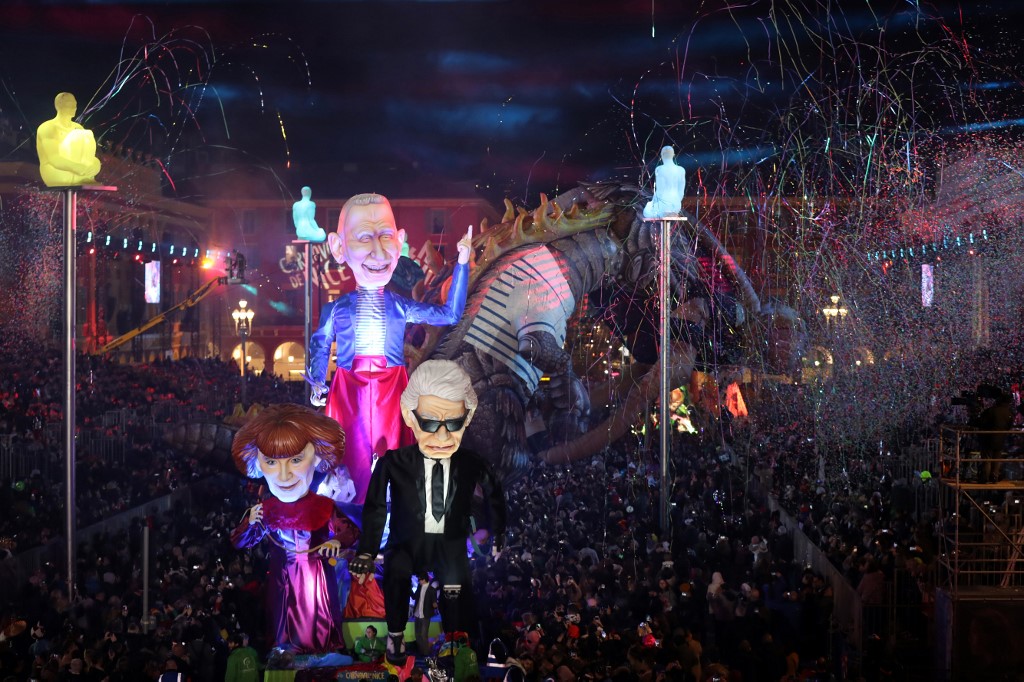 Giant figures depicting German fashion designer Karl Lagerfeld (R), and French fashion designers Sonia Rykiel (L) and Jean-Paul Gaultier are seen during the 136th Nice Carnival parade in Nice, southeastern France, on February 15, 2020. The Carnival takes place until February 29, 2020 on the theme 'King of Fashion'. VALERY HACHE / AFP