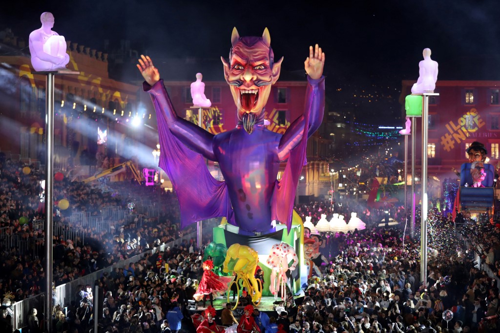 A giant figure depicting El Diablo is seen during the 136th Nice Carnival parade in Nice, southeastern France, on February 15, 2020. The Carnival takes place until February 29, 2020 on the theme 'King of Fashion'. VALERY HACHE / AFP