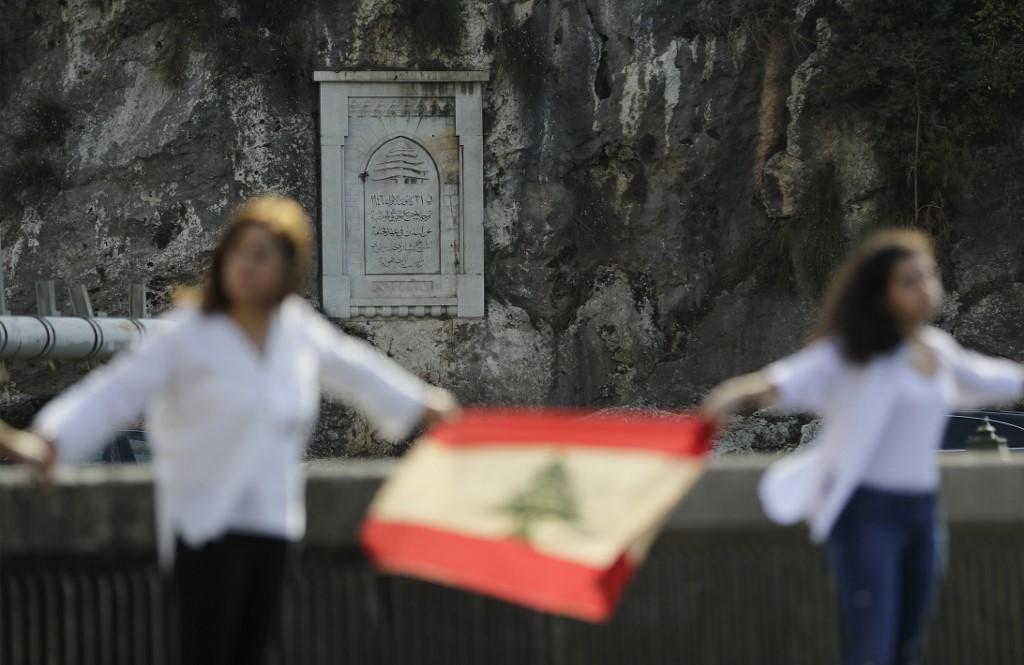 A picture taken on October 27, 2019, shows Lebanese protesters holding hands in the Nahr al-Kalb area, north of Beirut, to form a human chain along the coast from north to south as a symbol of unity, as part of ongoing anti-government demonstrations. The commemorative plaque carved in rock marks the full withdrawal of foreign troups in 1946, a couple of years after Lebanon's independence from the French mandate. JOSEPH EID / AFP