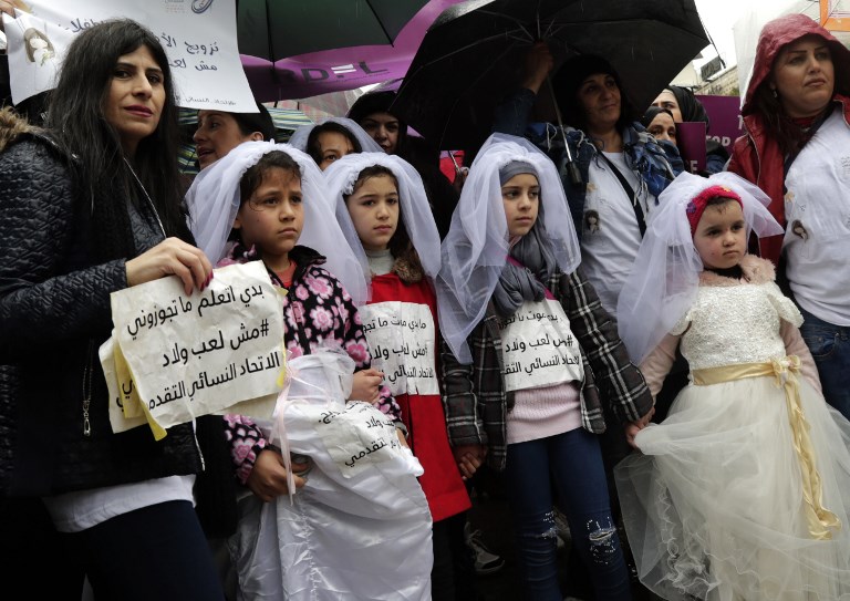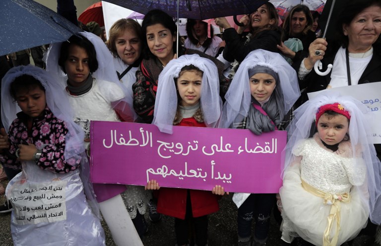 Young Lebanese girls disguised as brides hold a placard as they participate in a march against marriage before the age of 18, in the capital Beirut on March 2, 2019. The placard in Arabic reads "The end of child marriage begins by educating them".