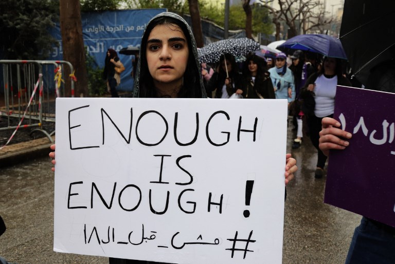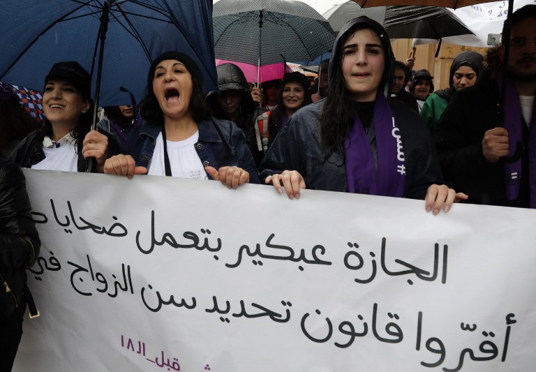 Lebanese demonstrators hold a banner as they participate in a march against marriage before the age of 18 in the capital Beirut on March 2, 2019. The banner in Arabic reads " Early marriage makes victims, change the law". ANWAR AMRO / AFP