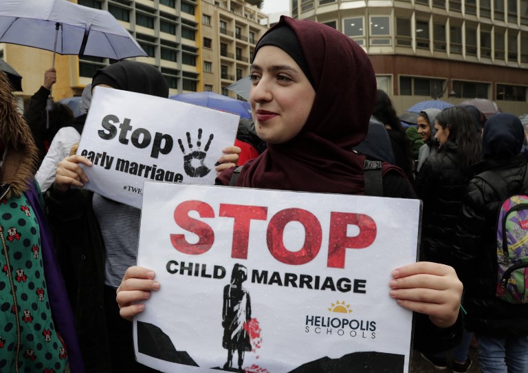 Lebanese demonstrators hold a banner as they participate in a march against marriage before the age of 18 in the capital Beirut on March 2, 2019. The banner in Arabic reads " Early marriage makes victims, change the law".