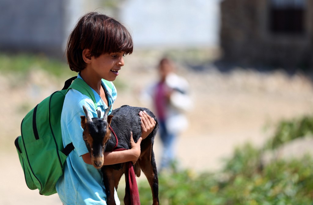 In the verdant highlands above the city, pupils in Al Kashar further their studies surrounded by goats grazing in nearby fields.