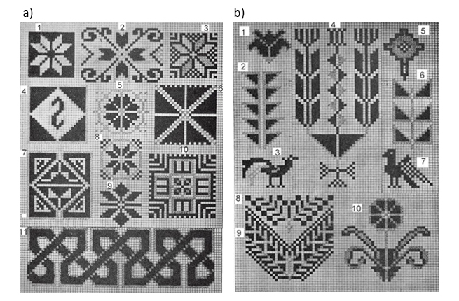 More than just pretty designs, Palestinian embroidery patterns carry deeper meanings, for example: Moon of Bethlehem (A1), Damask Rose (A5), Serpent (A11), Cauliflower (B1), Pigeon (B7), and Rainbow (B9) (Palestinian Embroider). (Palestinianembroider.tripod)