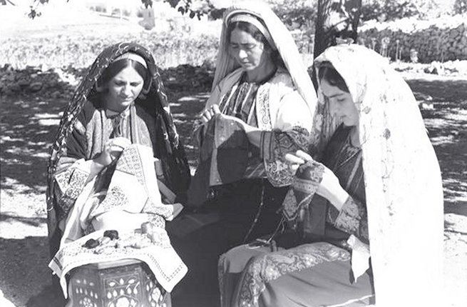 Ramallah, 1939-45. Traditionally, women used to gather to work on their embroidery projects, an occasion during which stories were not only told but became woven into the women’s embroideries. (Palestyle)
